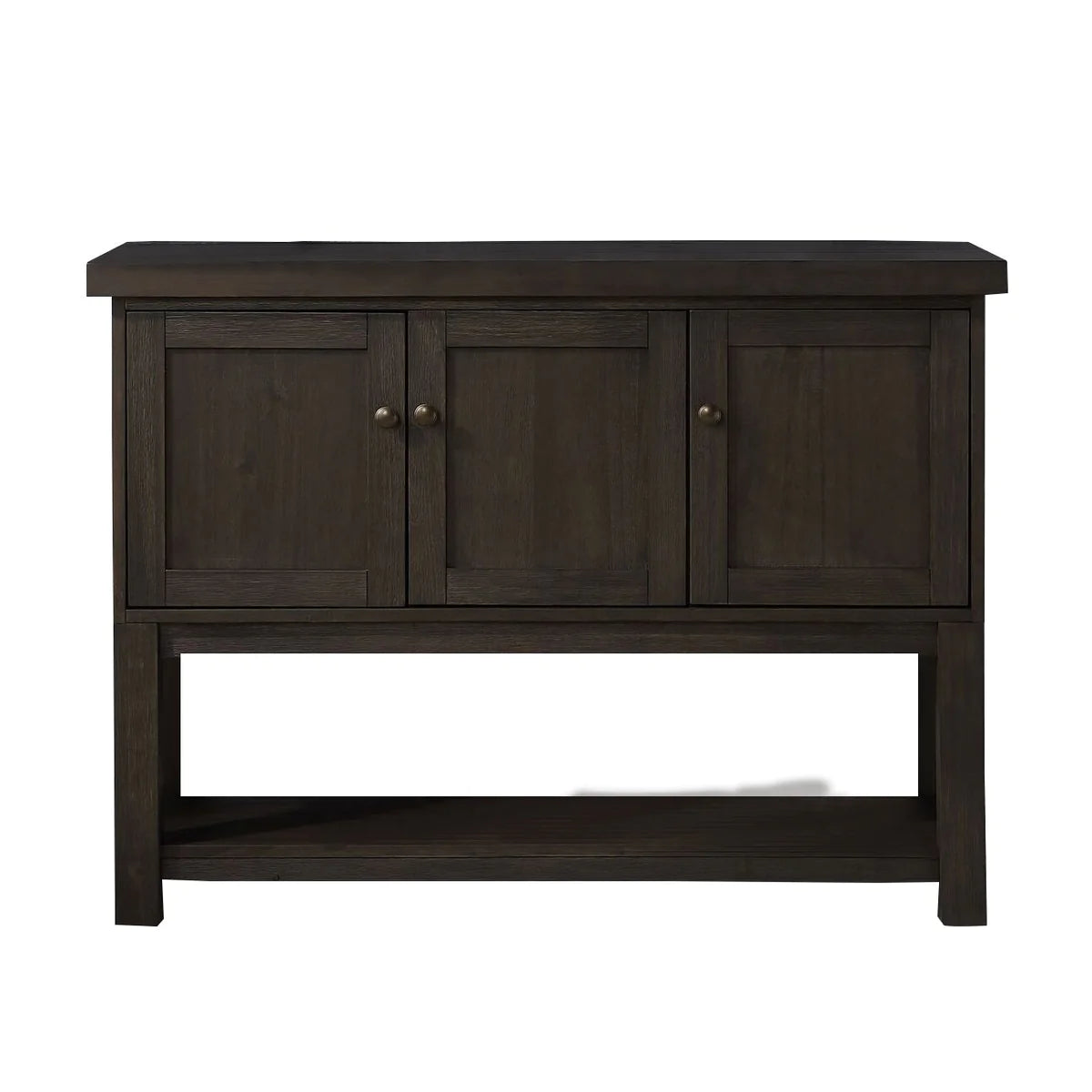 This simple and sophisticated design Server will surely bring great function to your living space. Constructed from solid wood and veneer, it features three doors accented with metal knobs and an open bottom shelf. Its distressed walnut finish lends a beautiful silhouette to the design that blends in perfectly with various decor styles.